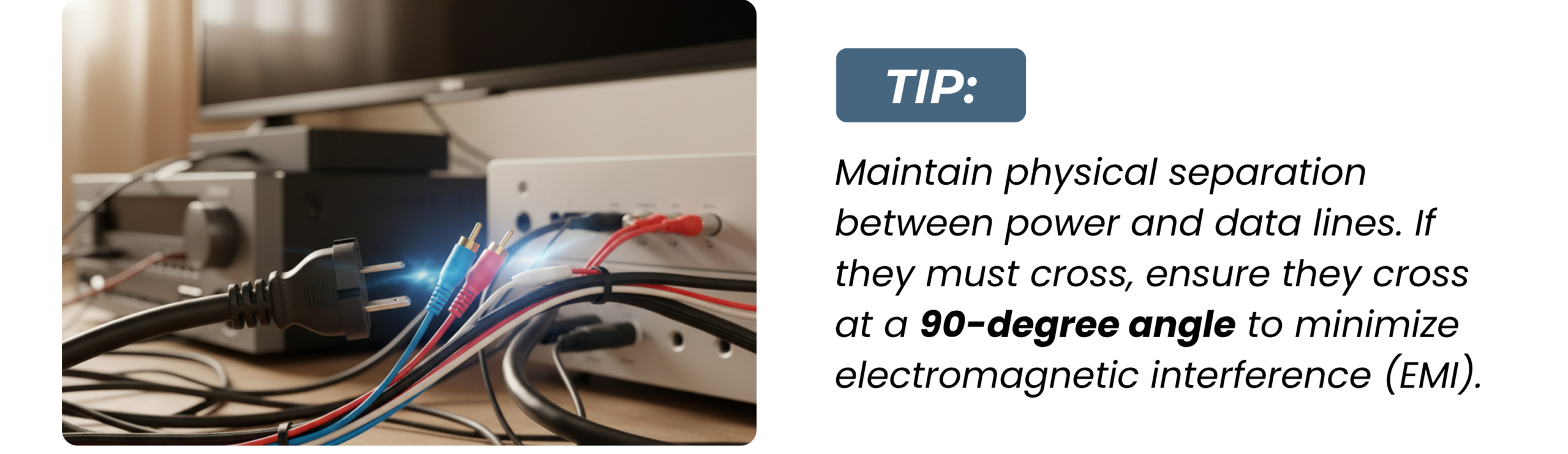 Running high-voltage power cables parallel to sensitive audio or data cables causes “Cross-talk“—that annoying humming or buzzing noise in speakers and data packet loss in networks.